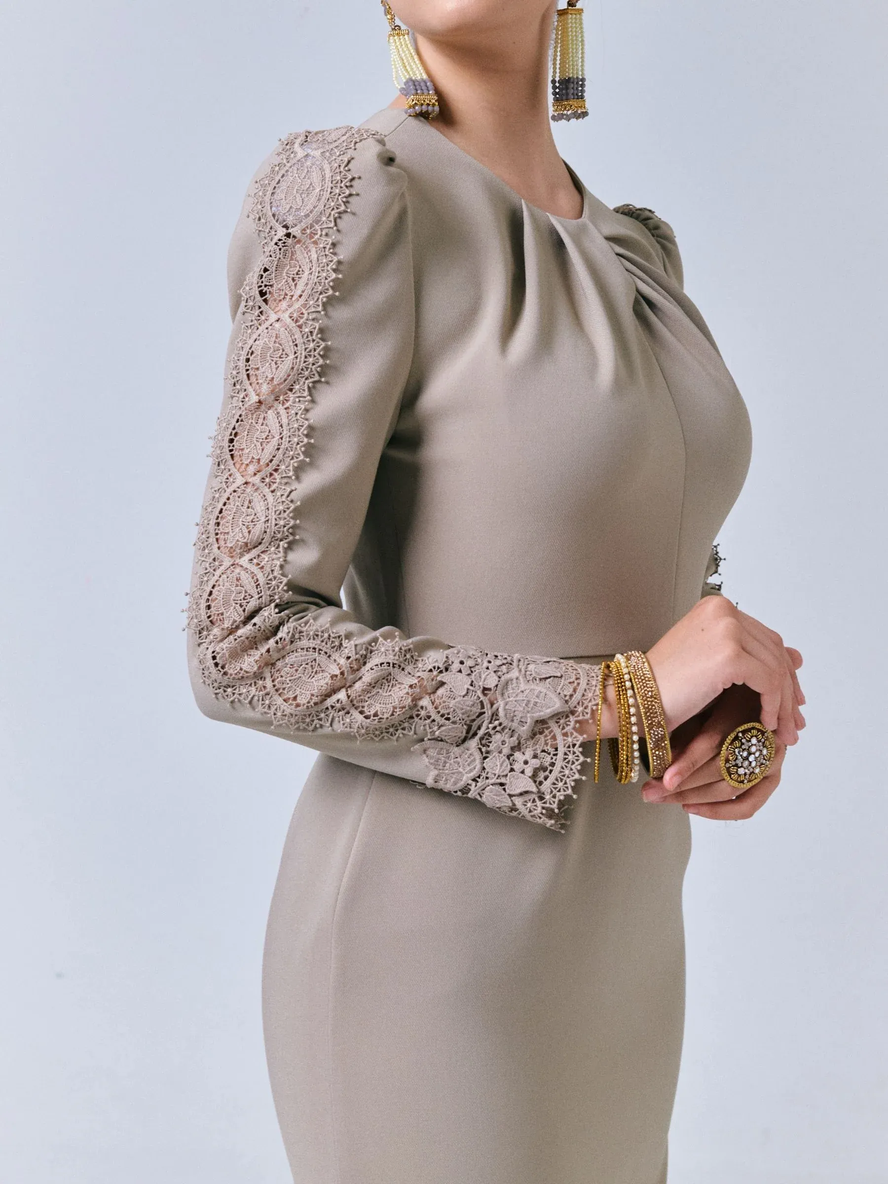 The solid tone long top is adorned with fagoting lace detail trimmings, a round neckline with pleat details, and long puff sleeves with delicate lace accents. The body-hugging silhouette is complemented with an unlined finish, providing a seamless look.