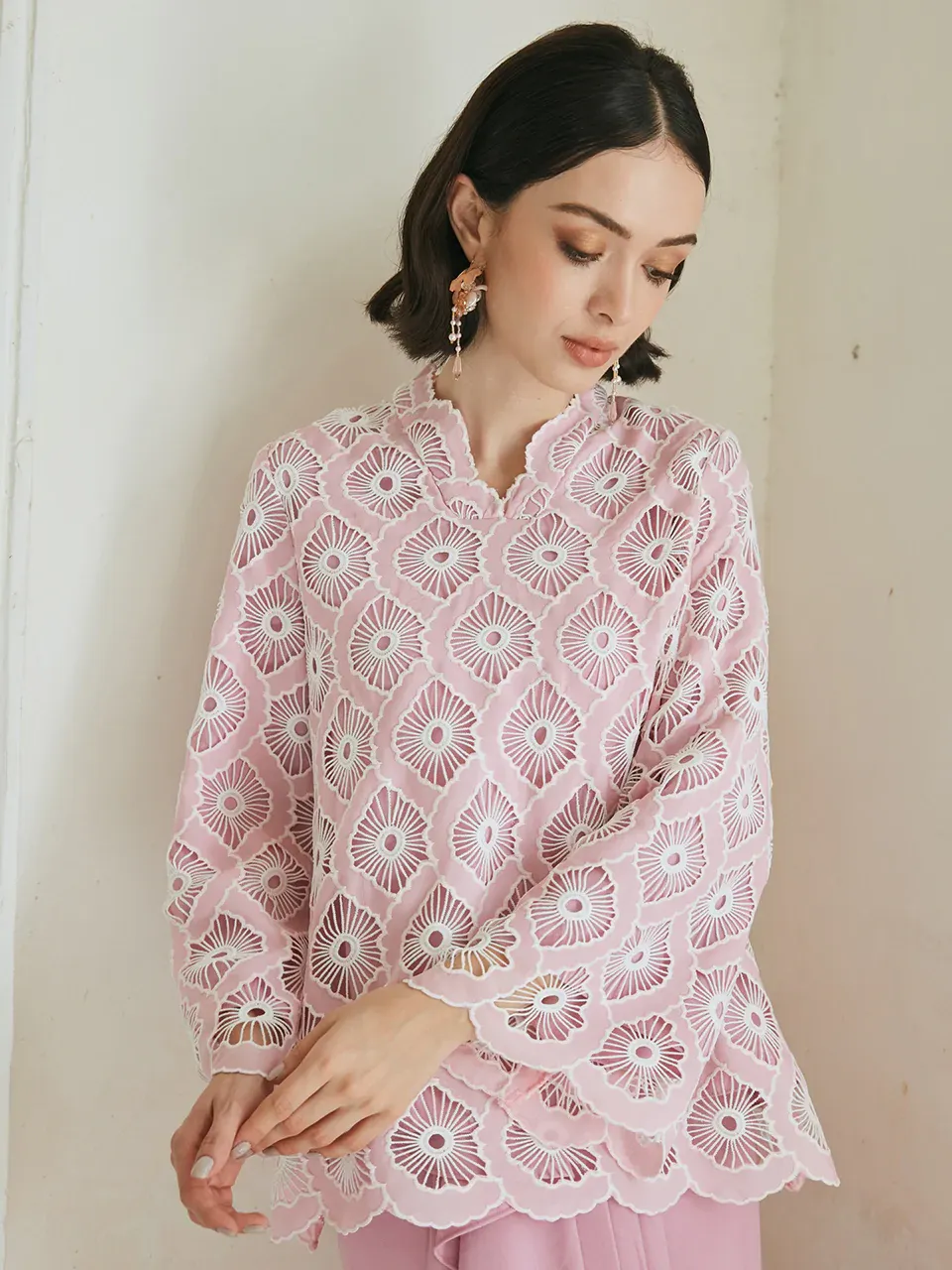 The Innai Red Intan Embroidered Lace Kurung Kedah with a drape skirt in pink, a traditional Malay attire with a fun and stylish twist. Made of Embroidered Chiffon with Cosmos pattern & Polycrepe, this kurung features a relaxed fit hip-length top with a panelled V-neckline, long trumpet sleeves and back press stud fastening. The ankle-length skirt comes with back pleats, an overlap style front drape panel, semi-elastic waistband and a concealed back zip fastening. Perfect for any casual or semi-formal events, this attire will make you stand out in the crowd with its unique and trendy design.