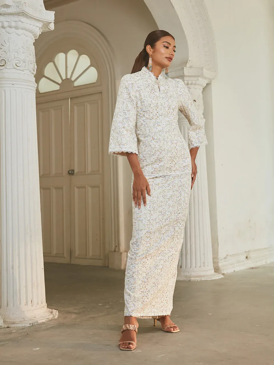 Introducing the Innai Red Sarima Short Kurung, a luxurious and elegant traditional Malay attire crafted from delicate eyelet cotton with a printed floral motif. Perfect for daywear during the festive season of Raya. The semi-fitted silhouette features a slightly raised collar with lace trim outlining, a keyhole opening at the neckline accented with cluster-style pearl beads for added detail, and the same lace trimming circles the ends of the ¾ length bell cut sleeves and hip-length hemline. This short kurung is designed to be worn with its matching column cut skirt that features back pleats for a classic look that evokes feelings of nostalgia. This attire is suitable for any formal or traditional events, and it will give you a chic and elegant look.