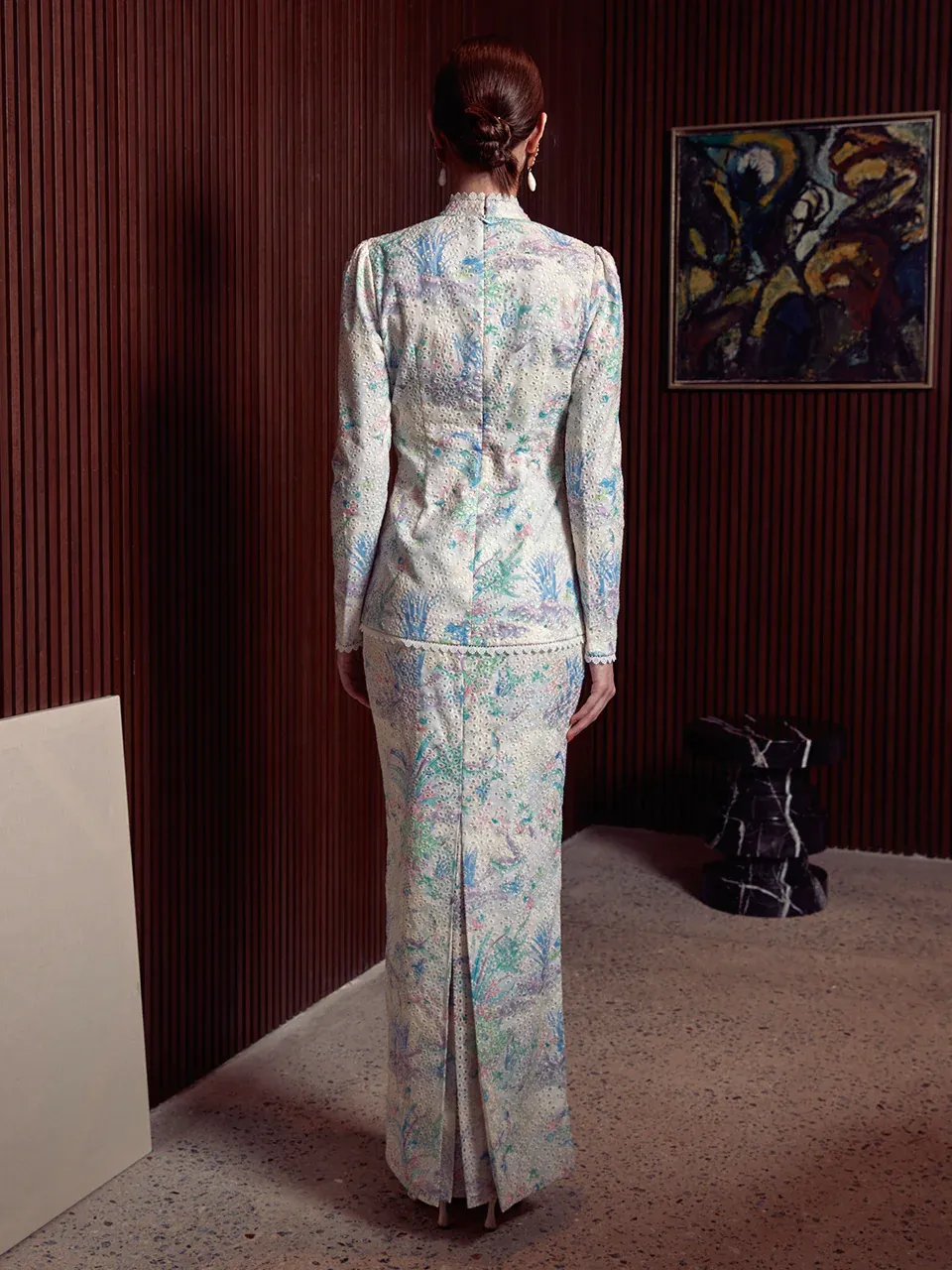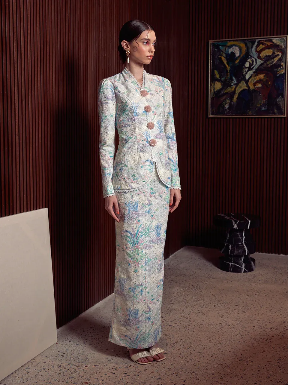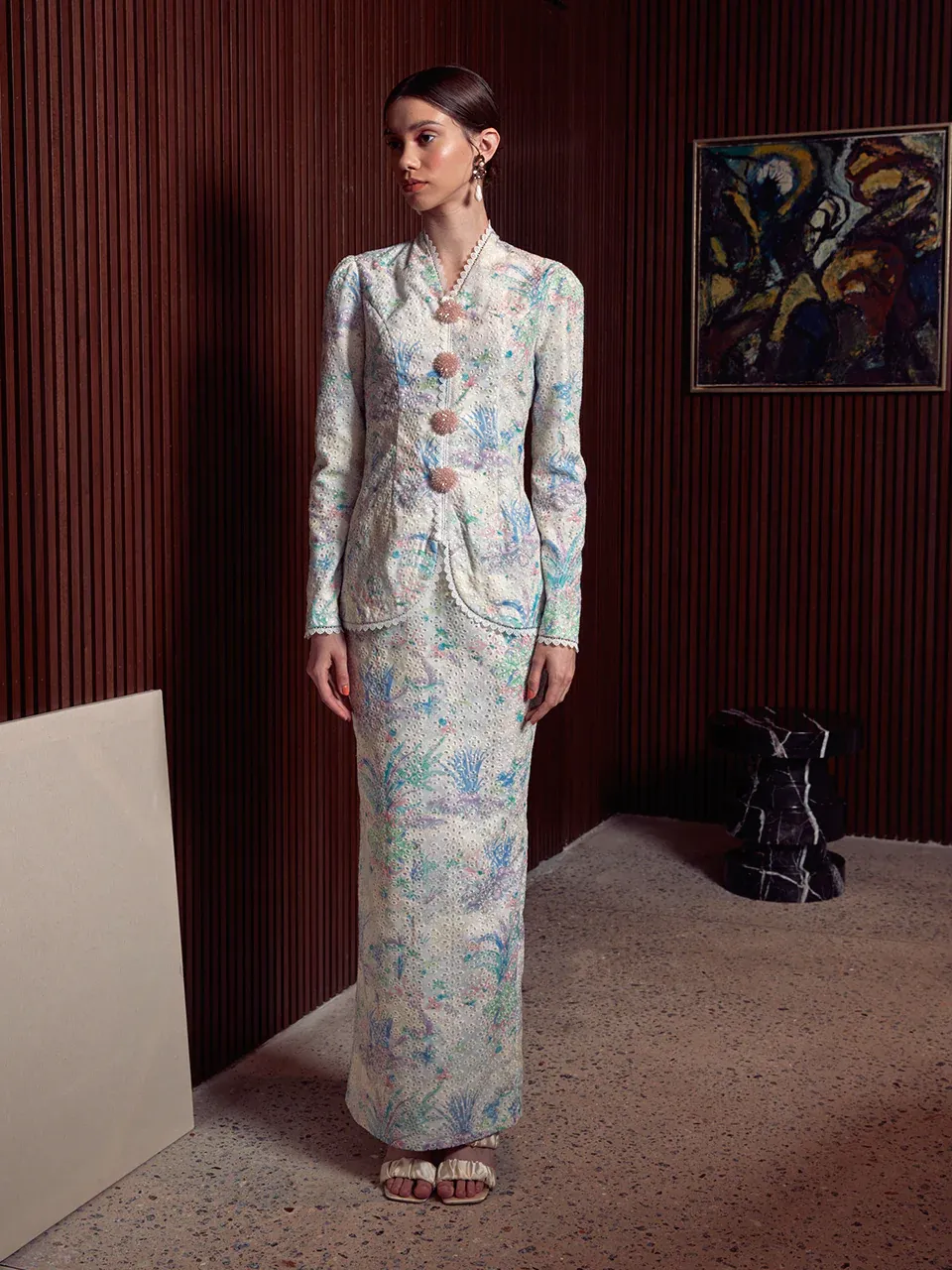 Embrace timeless elegance with Innai Red's Sierra Short Baju Kebaya in a refreshing Blue. A masterpiece of understated luxury, this ensemble balances traditional charm with contemporary details, offering a feminine aesthetic true to its roots. Crafted from embroidered eyelet cotton, the short kebaya reveals a delicate blend of pastel colours that deserves admiration. The simple silhouette, enhanced by subtly puffed shoulders and guipure lace trim, is accentuated by clusters of hand-sewn crystal beads, adding a touch of sparkle. The ensemble is completed with a complementary column cut skirt, further enhancing the piece's fit and comfort. Experience the innate grace of this beautifully designed short Baju Kebaya, a symbol of sophisticated simplicity.