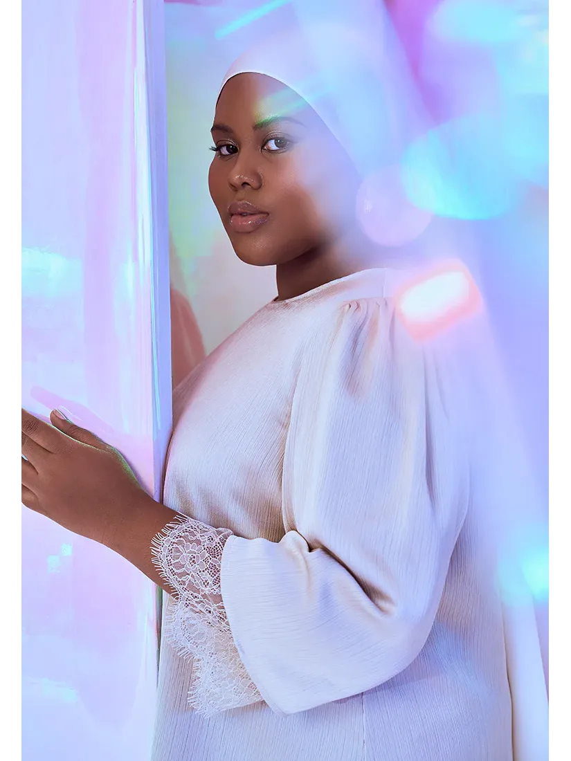 Graceful and effortlessly elegant, the Emara Baju Kurung in beige is designed with a modern silhouette and intricate lace detailing. Made from a light textured crepe blend, it features a classic round neckline, 7/8 sleeves with delicate lace hemming, and a relaxed yet refined fit.