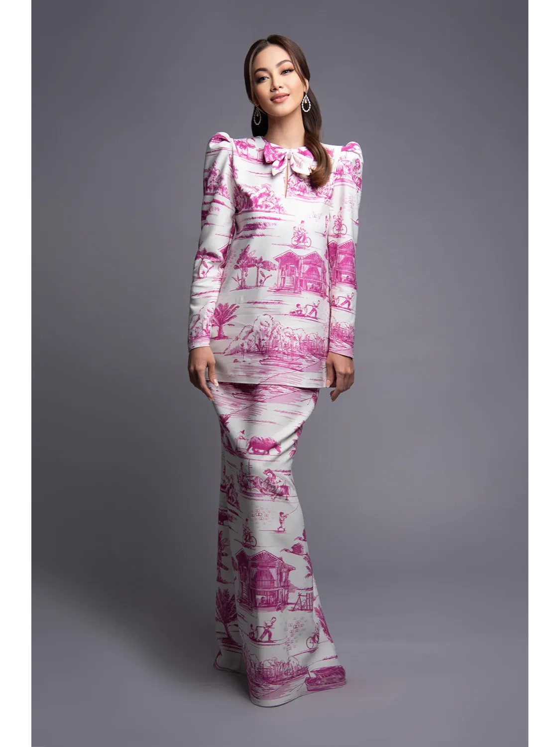 Elevate your style with Rizman Ruzaini's Daiyan Baju Kurung Kedah in eye-catching Shocking Pink. Our classic toile print brings forth a traditional Raya feel, giving this attire a unique, cultural twist. Branded with the distinct RR logo and showcasing the local-inspired Kampong de Jouy print, this ensemble exudes a vibe that is both familiar and contemporary. The added bow detail injects a sweet, girly touch, perfect for those looking to add a playful element to their look. Be the trendsetter with this Baju Kurung Kedah, an essential addition to your dynamic wardrobe.