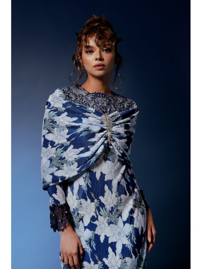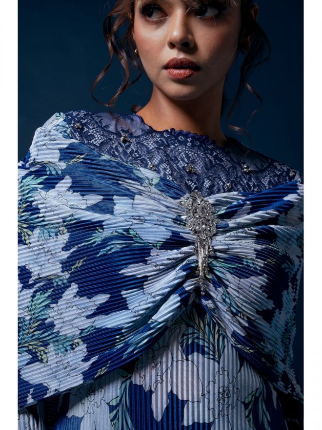 Temujanji Maisara Baju Kurung Printed Pleats Cobalt Blue