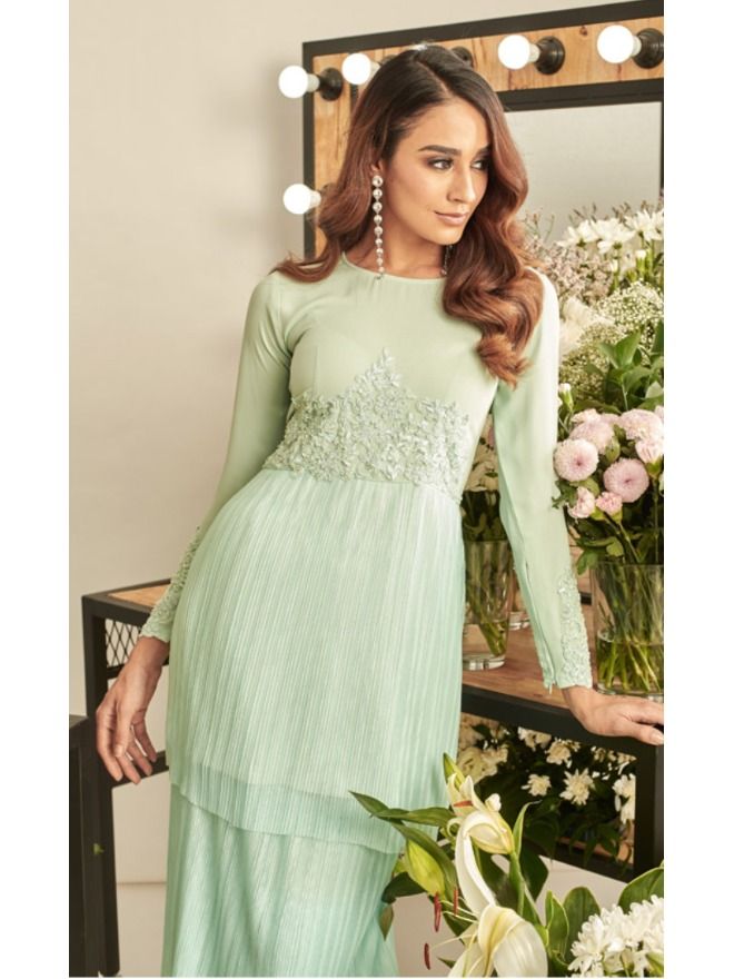 Experience simple luxury with the Aina Hariz Alya Tiered Luxe Baju Kurung in Mint Green. This ensemble features an empire cut top and a two-tiered A-line skirt, both adorned with pleated net detail for a slimming effect. Its loose waistline makes it a comfortable choice for pregnant mothers. Highlighted with premium, heavy beaded lace and 3D crumble beads made of scattered pearls and diamonds, this outfit exudes ultimate glamour. It comes with a hidden back zip fastening and is crafted from premium Polycrepe and Pleated Net. Choose this Baju Kurung for an effortlessly elegant look.