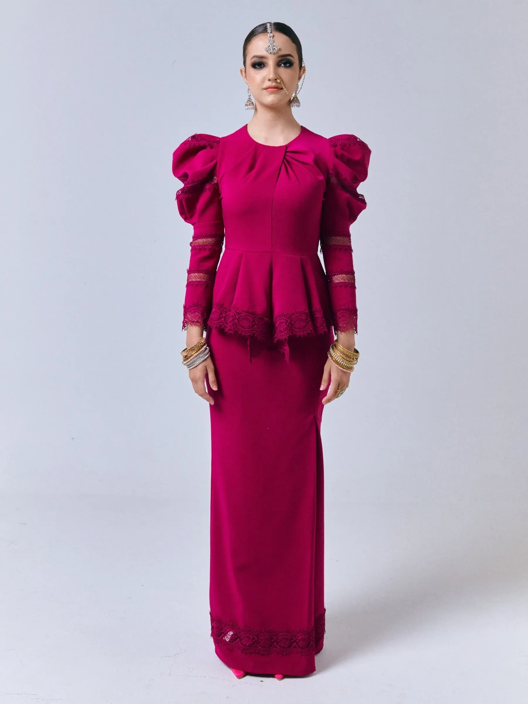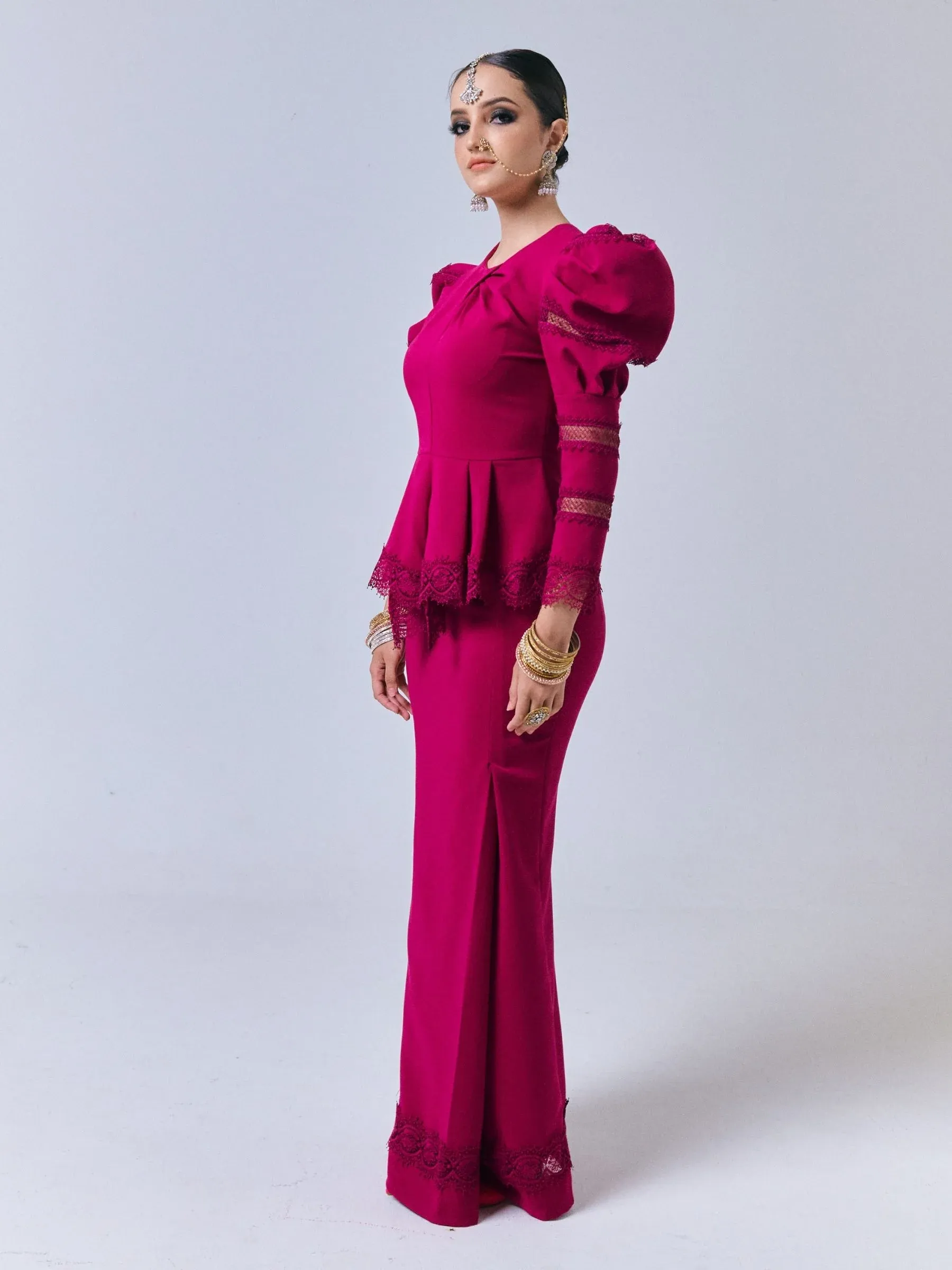 Introducing the exquisite Fiziwoo Anushka Baju Peplum, an embodiment of sophistication and style. The garment's short modern kurung design is adorned in a striking fuchsia pink hue that exudes luxury and class.