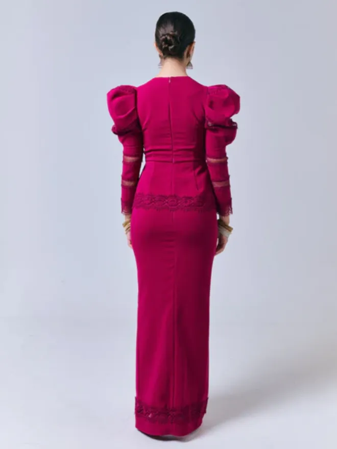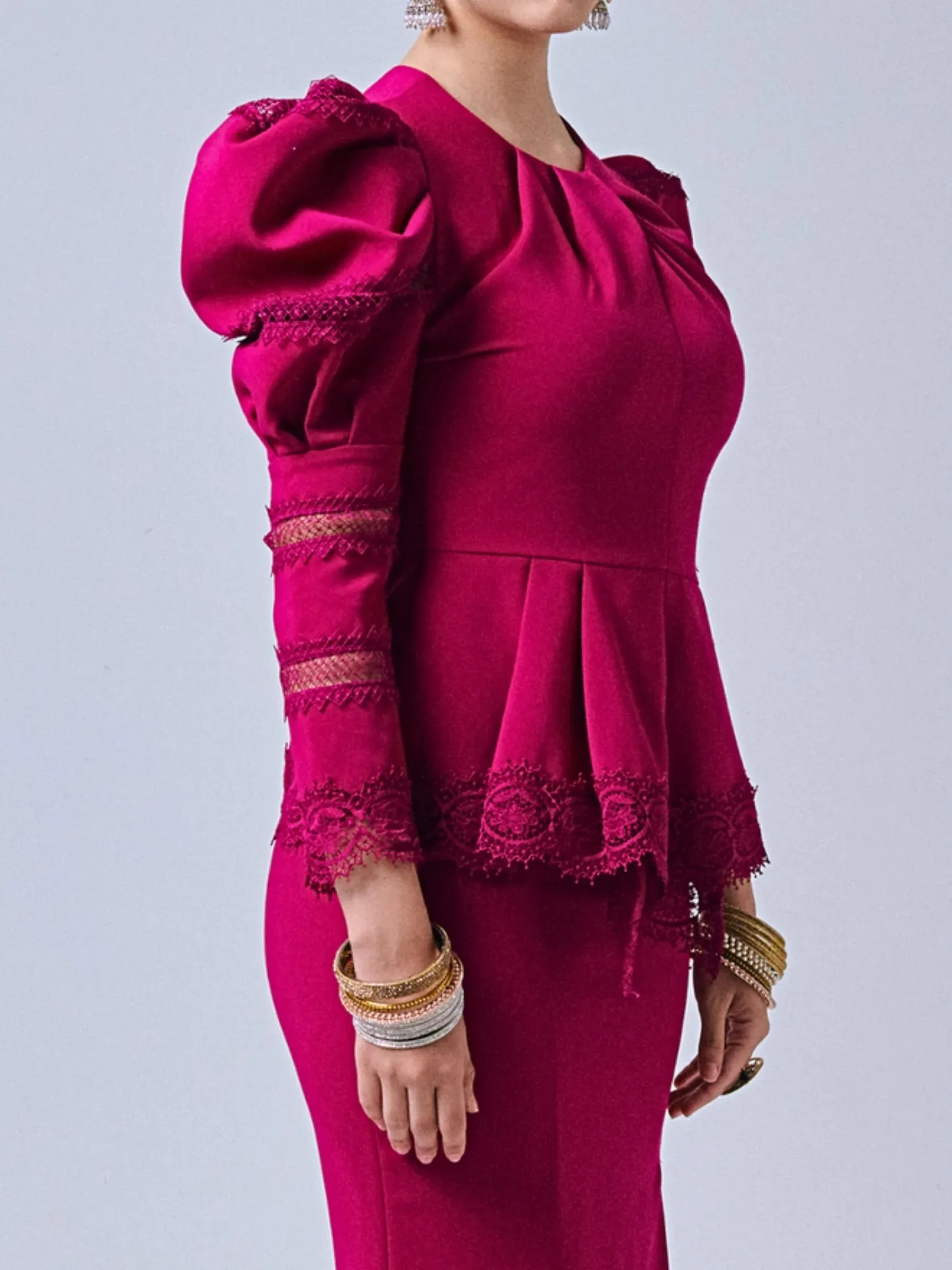 Crafted from a premium cotton polyblend fabric, this piece features impeccable attention to detail. The solid-tone peplum top boasts intricate fagoting lace detail and a pleated round neckline, while the long puff shoulder sleeves add a touch of elegance with delicate lace accents.