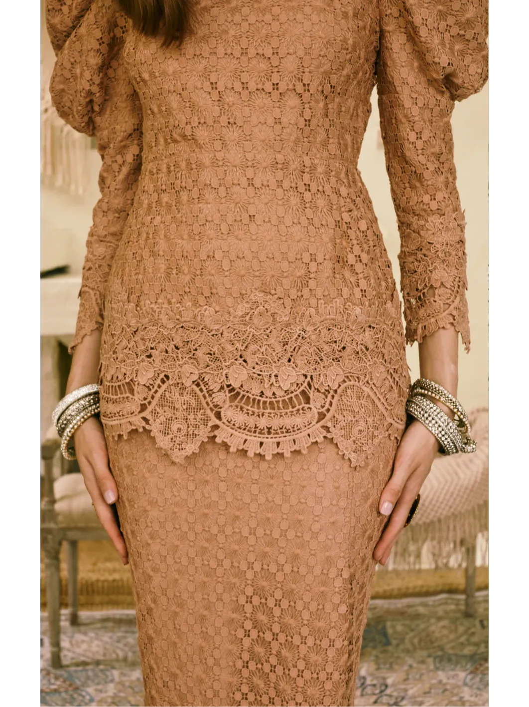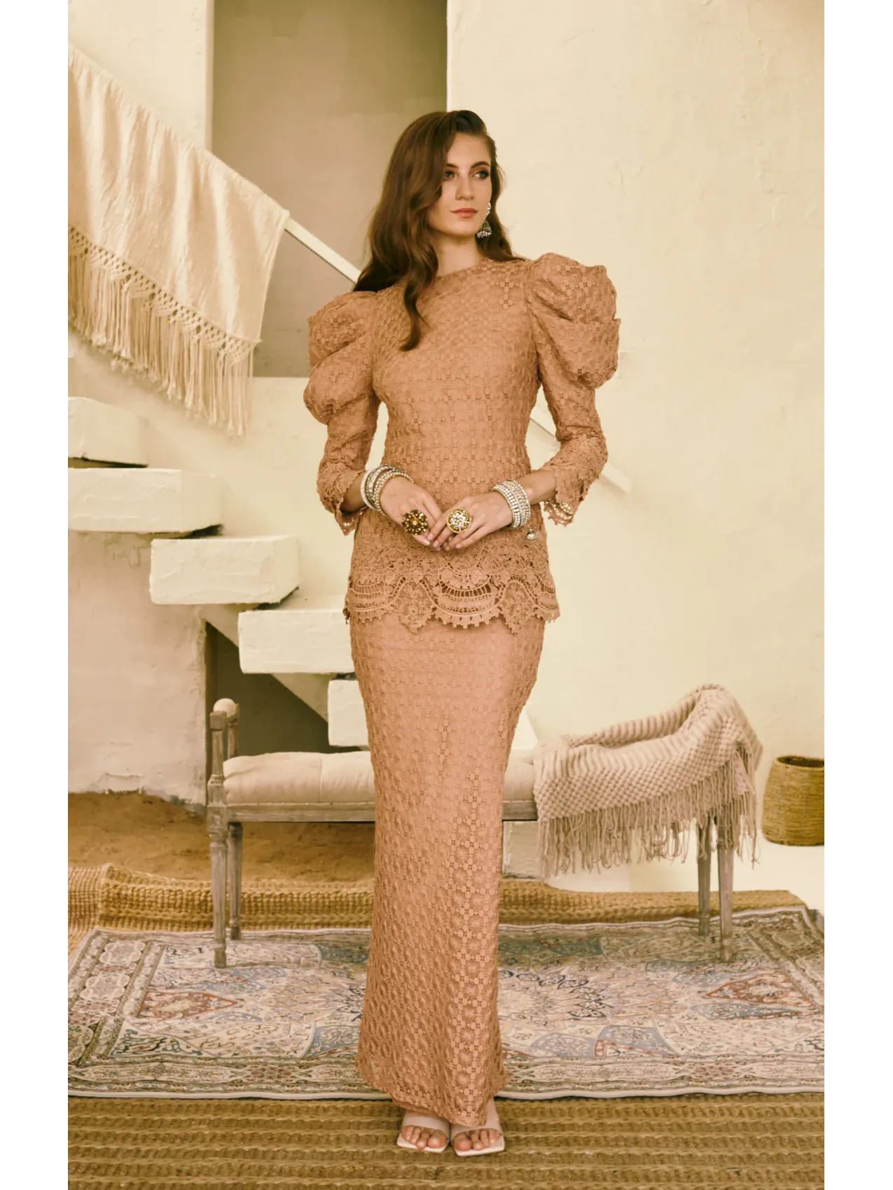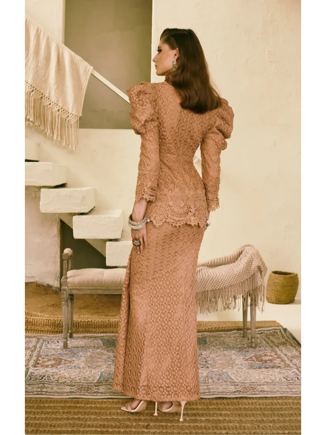 This outfit demands delicate care. Bleaching is not recommended. Experience this timeless ensemble and make a statement at your next event.