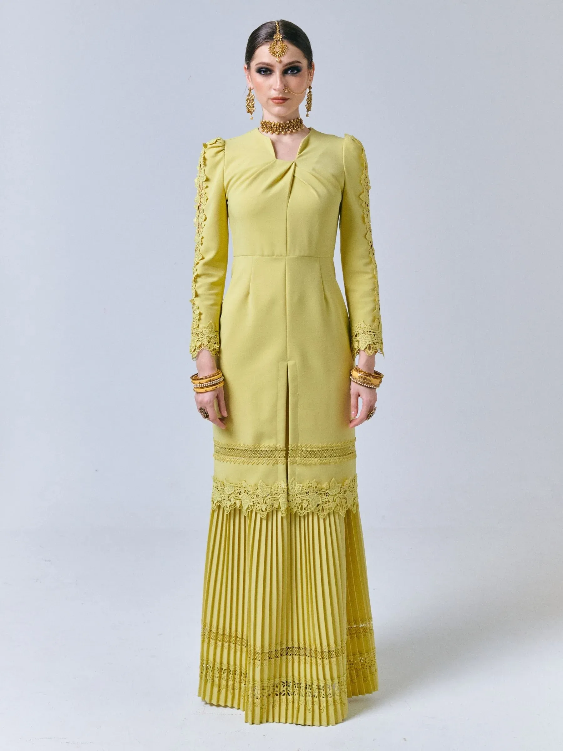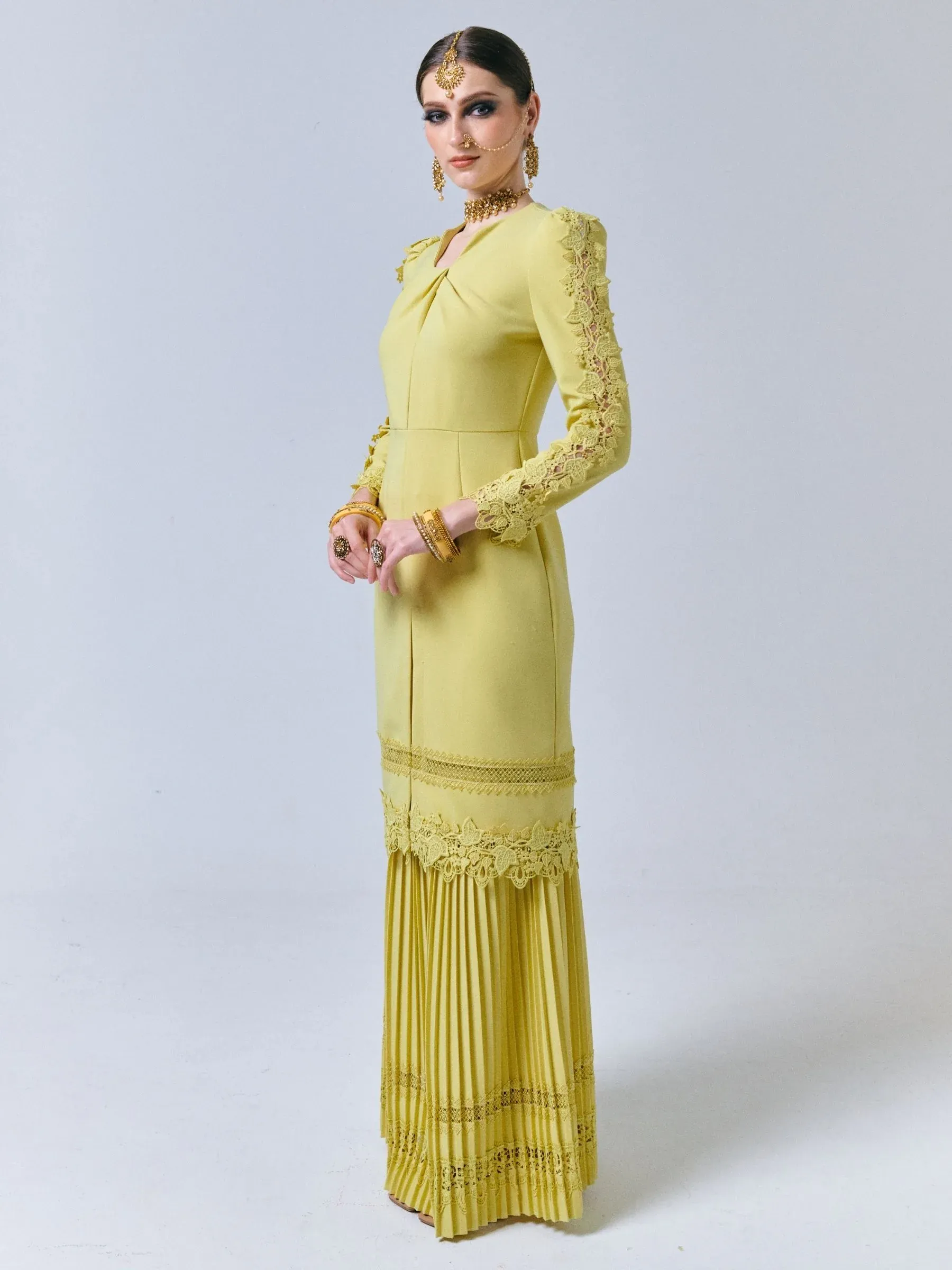 Introducing the opulent Fiziwoo Kenchana in Pastel Yellow, a stunning piece of fashion that exudes modern elegance. The exquisite long Kebarung silhouette boasts a pleated mermaid skirt, expertly crafted from a luxurious cotton polyblend fabric.