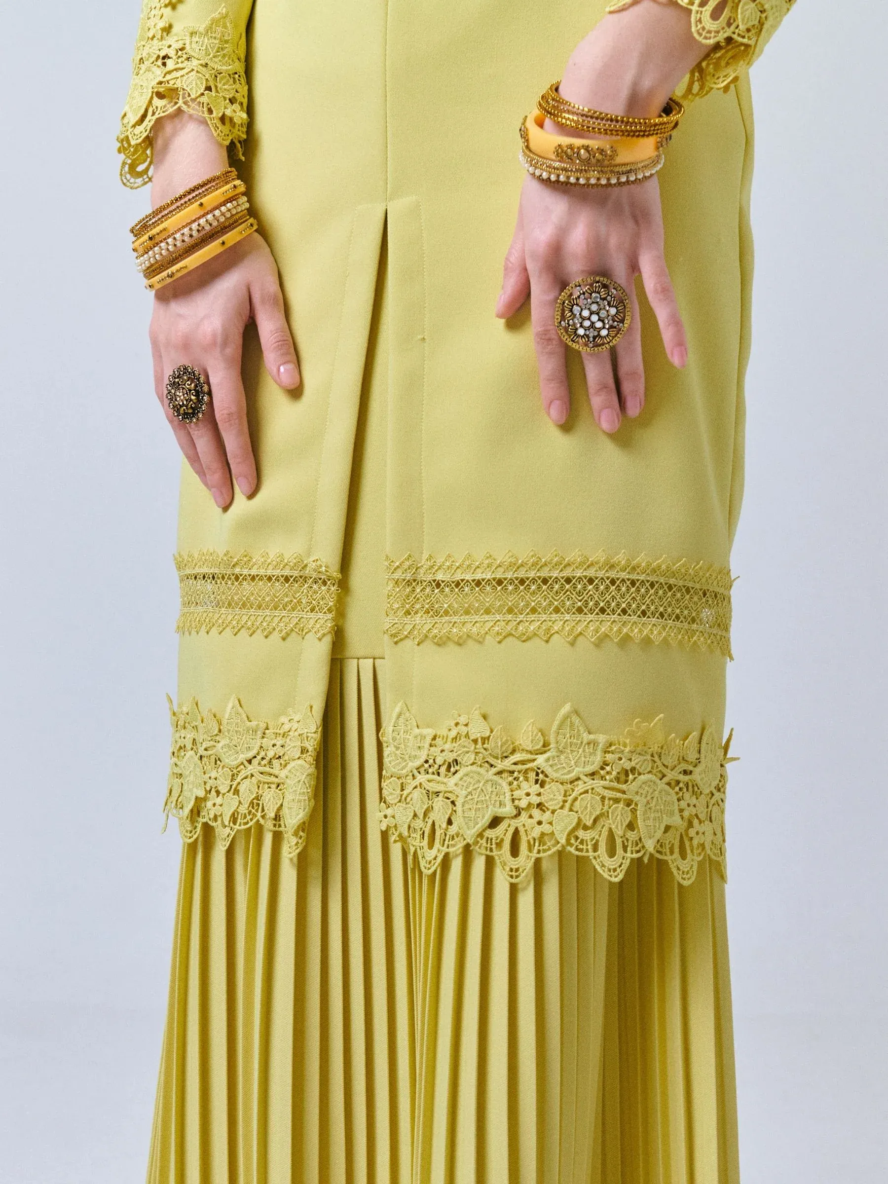 The bottom of the Kenchana is equally impressive, with a pleated mermaid skirt that features tasteful lace inserts. The elasticised back waistband ensures a comfortable fit, while the back invisible zip fastening maintains a sleek and elegant appearance. The skirt also remains unlined, allowing the fabric to fall effortlessly and with natural grace.