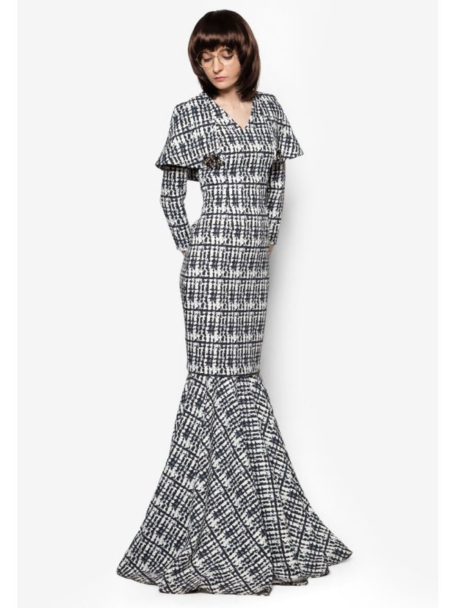 Introducing the Fiziwoo Muruku Baju Kurung in Black White, a masterpiece of luxury and sophistication. The Kurung Muruku boasts a stunning mermaid silhouette that gracefully flows to the floor, enveloping the wearer in a regal aura that commands attention.