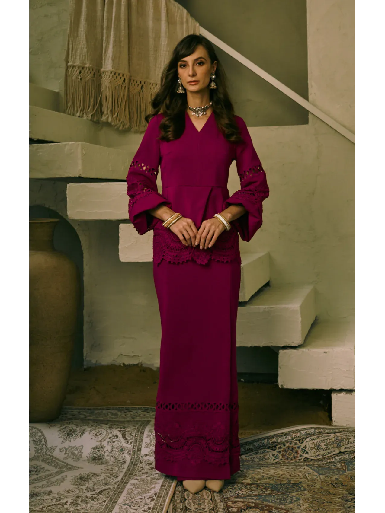 This outfit demands delicate care. Bleaching is not recommended. Experience this timeless ensemble and make a statement at your next event.
