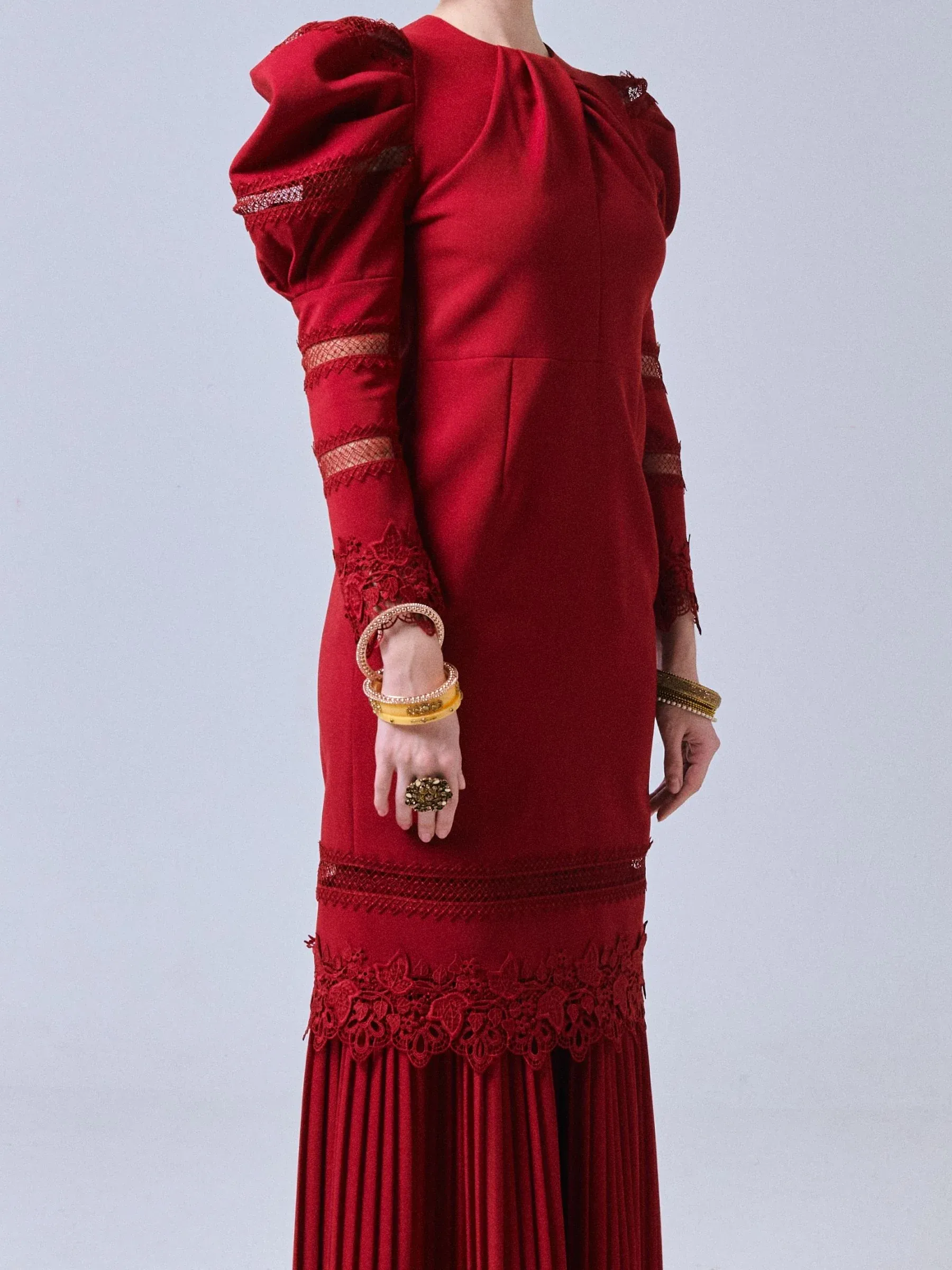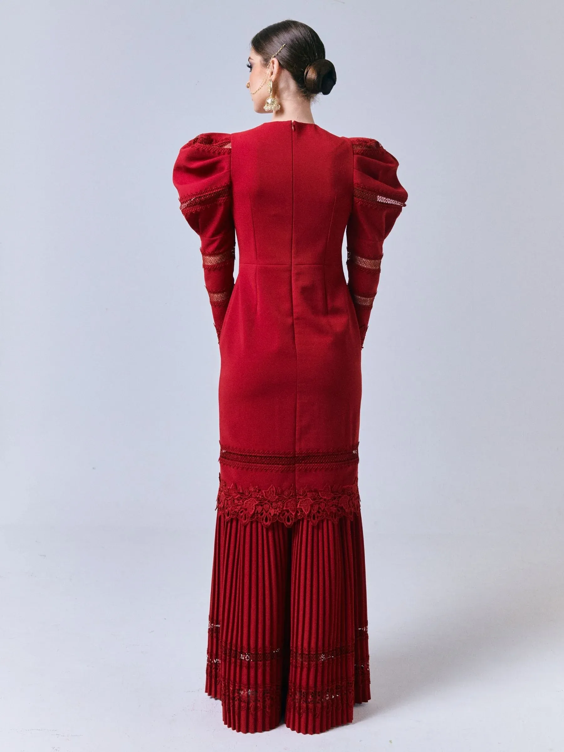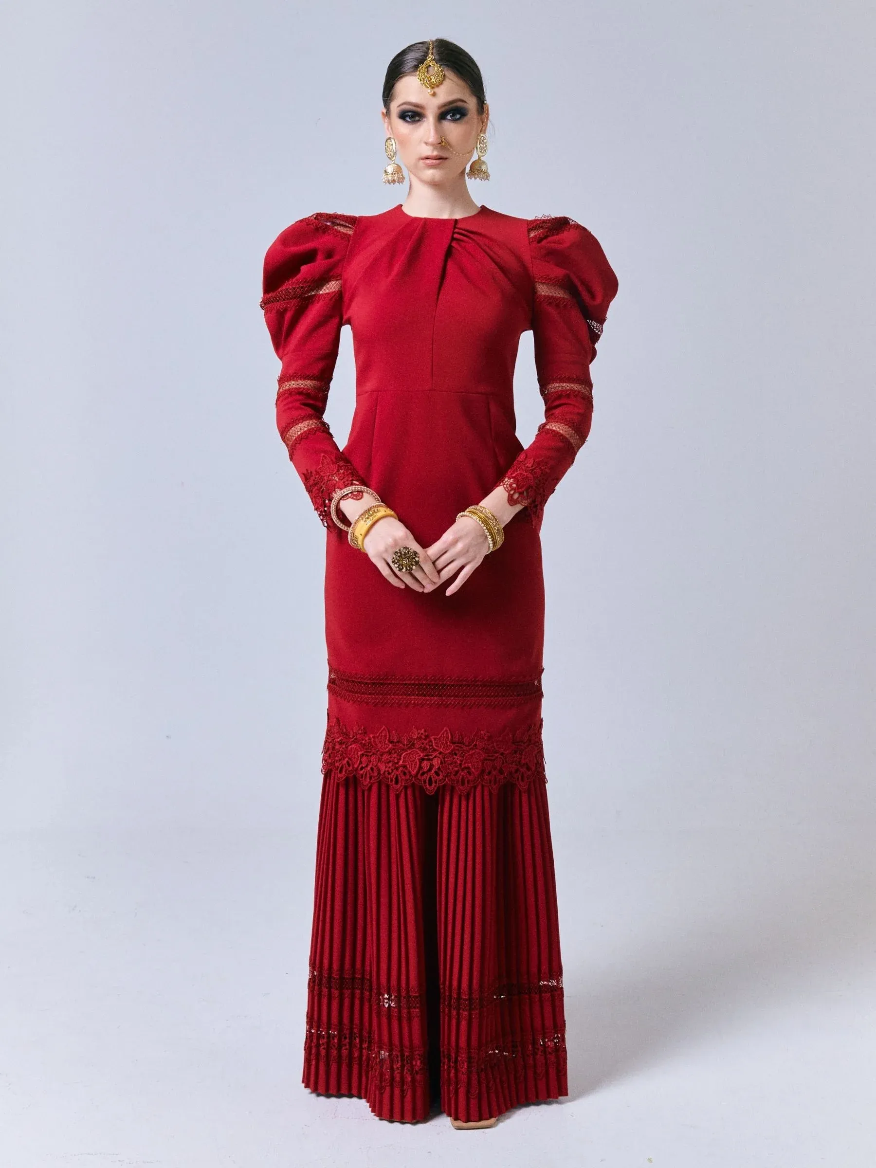 Crafted from a luxurious cotton polyblend fabric, this long kurung features a pleated mermaid cut skirt that adds a touch of graceful femininity to your silhouette. The top boasts a solid tone with delicate fagoting lace detail, a round neckline with intricate pleat detailing, and long puff shoulder sleeves with lace accents that elevate the overall design.