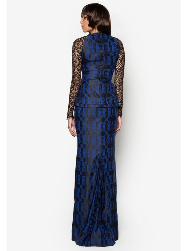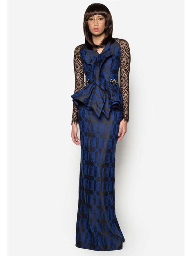 Presenting the exquisite Fiziwoo Rendang Baju Kurung in Blue Navy, a luxurious masterpiece that embodies sophistication and refinement. Designed by the iconic Fiziwoo, this ensemble showcases a remarkable peplum-pencil silhouette that is elevated by the intricate lace sleeves and regal rhinestone embellishment on the waist.