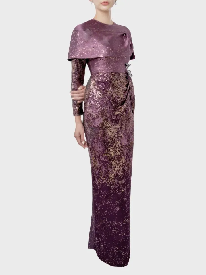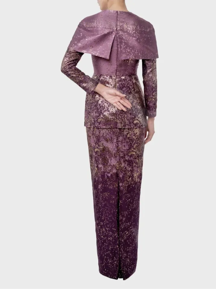 Embrace grace and sophistication with the Fiziwoo Shasha Baju Peplum Kurung in enchanting dusty purple, a design that combines elegance with modern artistry. Crafted from shimmering metallic jacquard with delicate gold detailing, this ensemble offers a refined and luxurious appeal.