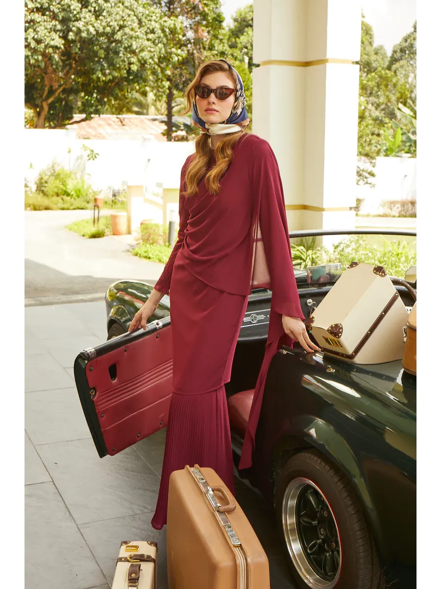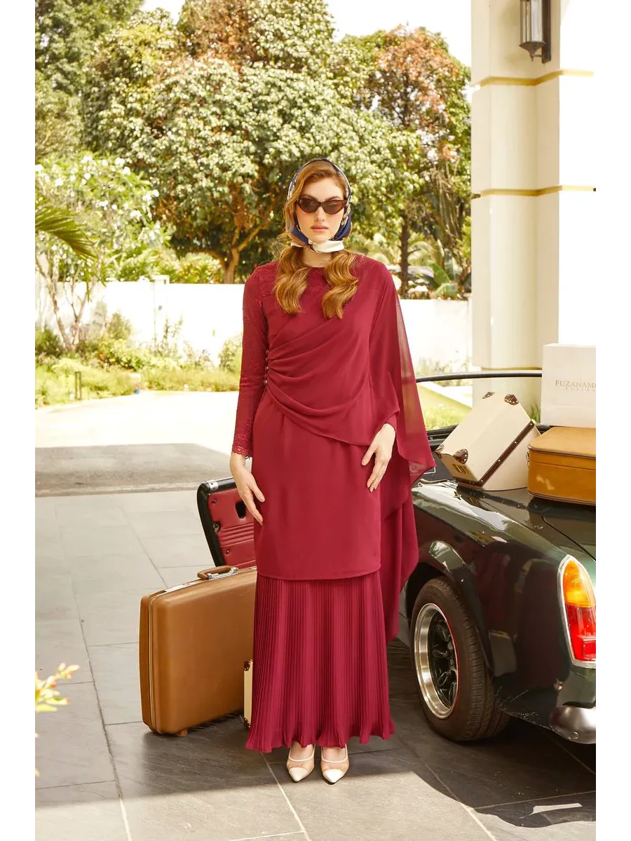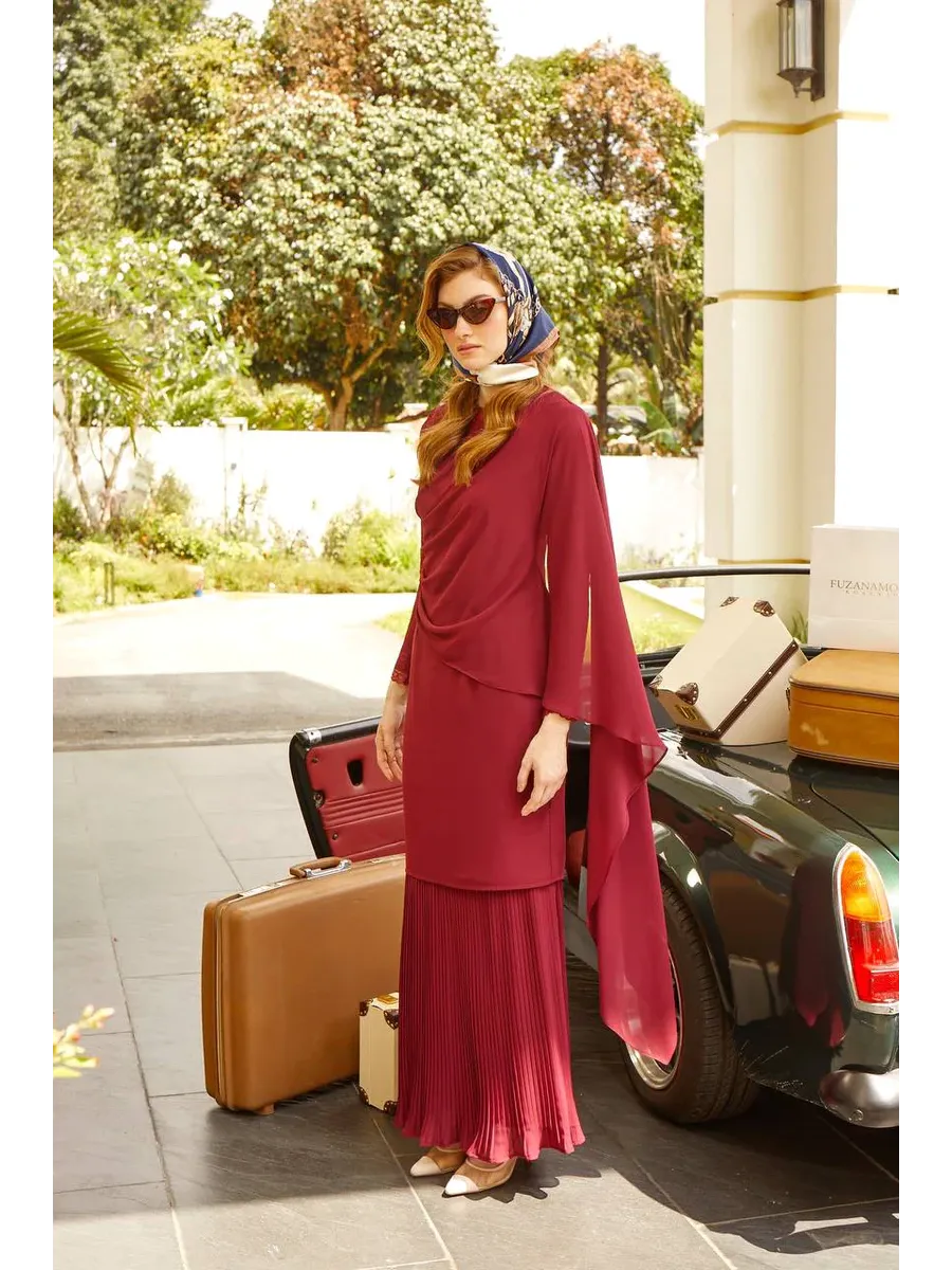 Introducing the elegant and luxurious Fuzana Mokhtaza Hasmah Baju Kurung in the striking shade of maroon, designed for the modern woman who values both style and comfort.