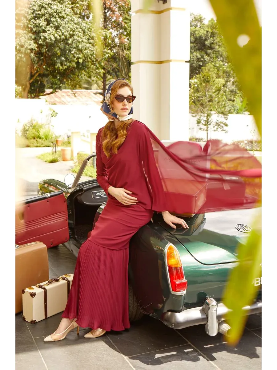 The attached draped shawl with lace sleeves and shoulder details adds an element of drama and flair, making a bold statement wherever you go. The pleated mermaid skirt complements the top perfectly, with a semi-fitted full-length design crafted from pleated chiffon and lined with luxurious fabric. The skirt features a concealed side zip fastening for a sleek and seamless look.