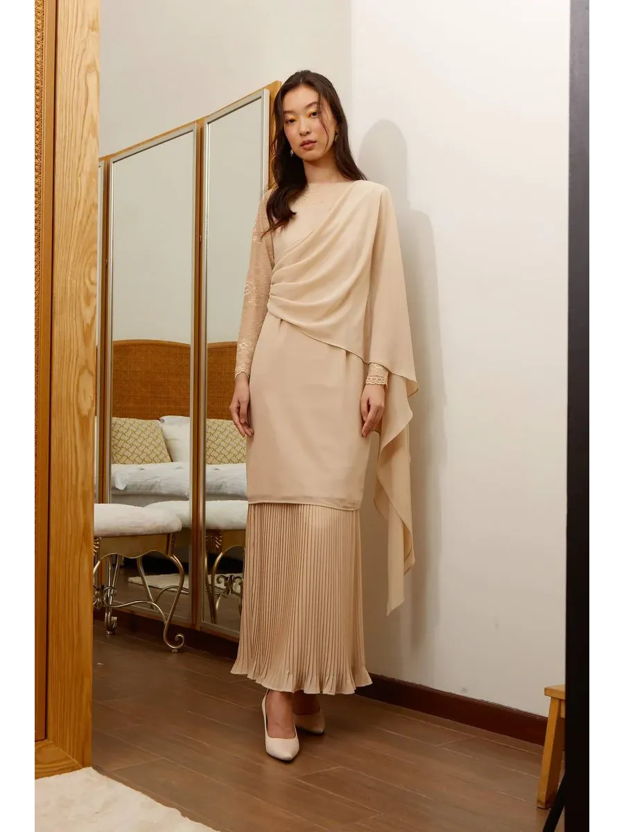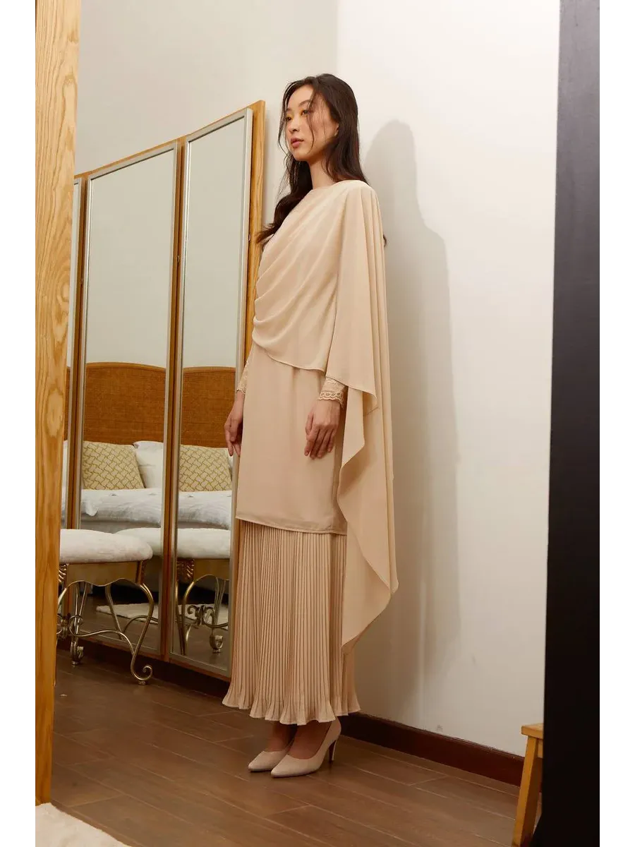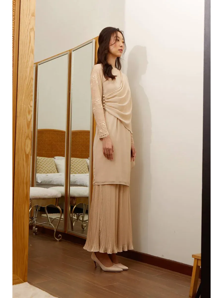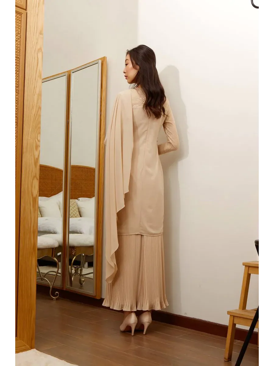 Introducing the elegant and luxurious Fuzana Mokhtaza Hasmah Baju Kurung in the striking shade of nude, designed for the modern woman who values both style and comfort.