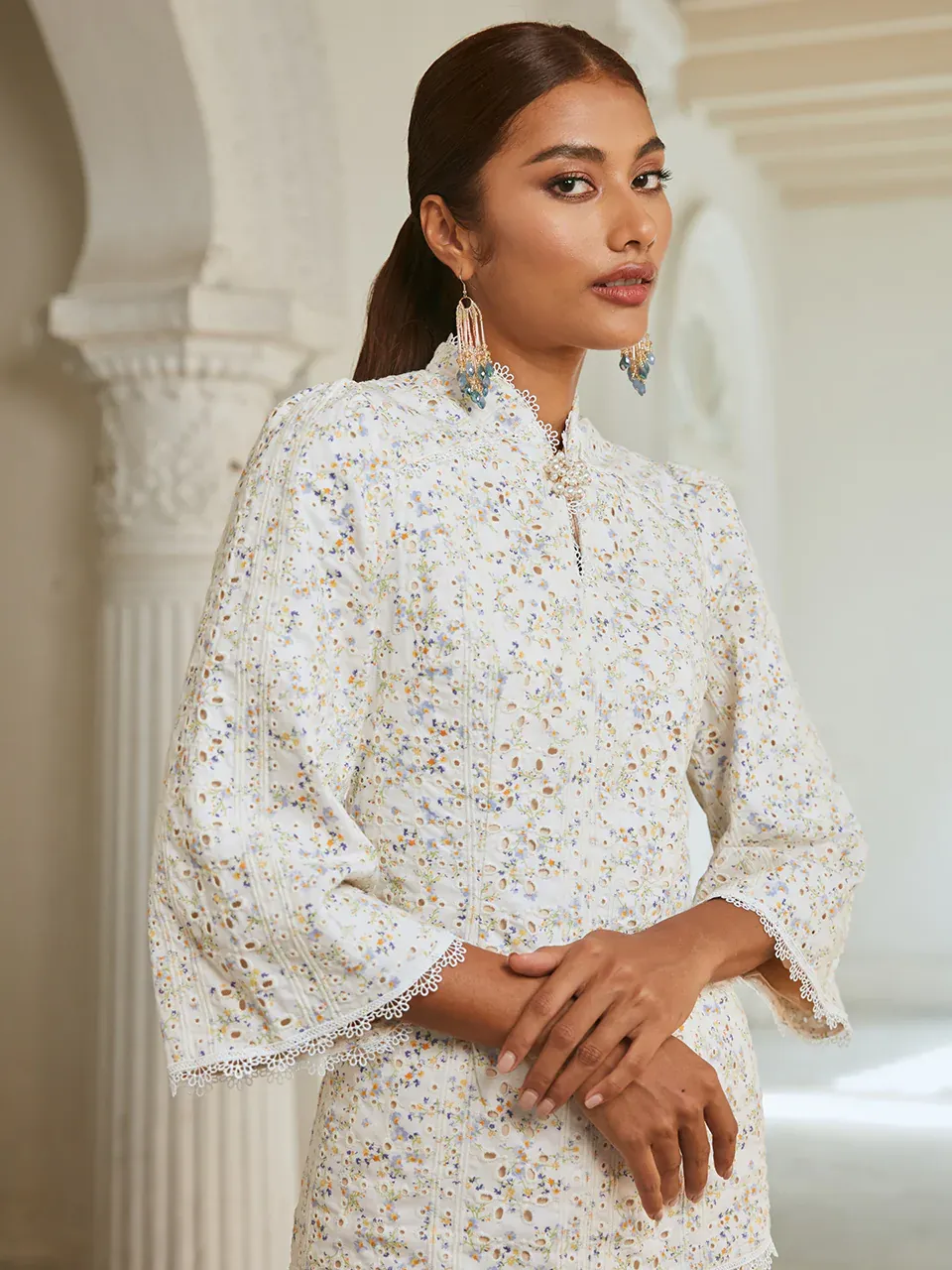 Introducing the Innai Red Sarima Short Kurung, a luxurious and elegant traditional Malay attire crafted from delicate eyelet cotton with a printed floral motif. Perfect for daywear during the festive season of Raya. The semi-fitted silhouette features a slightly raised collar with lace trim outlining, a keyhole opening at the neckline accented with cluster-style pearl beads for added detail, and the same lace trimming circles the ends of the ¾ length bell cut sleeves and hip-length hemline. This short kurung is designed to be worn with its matching column cut skirt that features back pleats for a classic look that evokes feelings of nostalgia. This attire is suitable for any formal or traditional events, and it will give you a chic and elegant look.