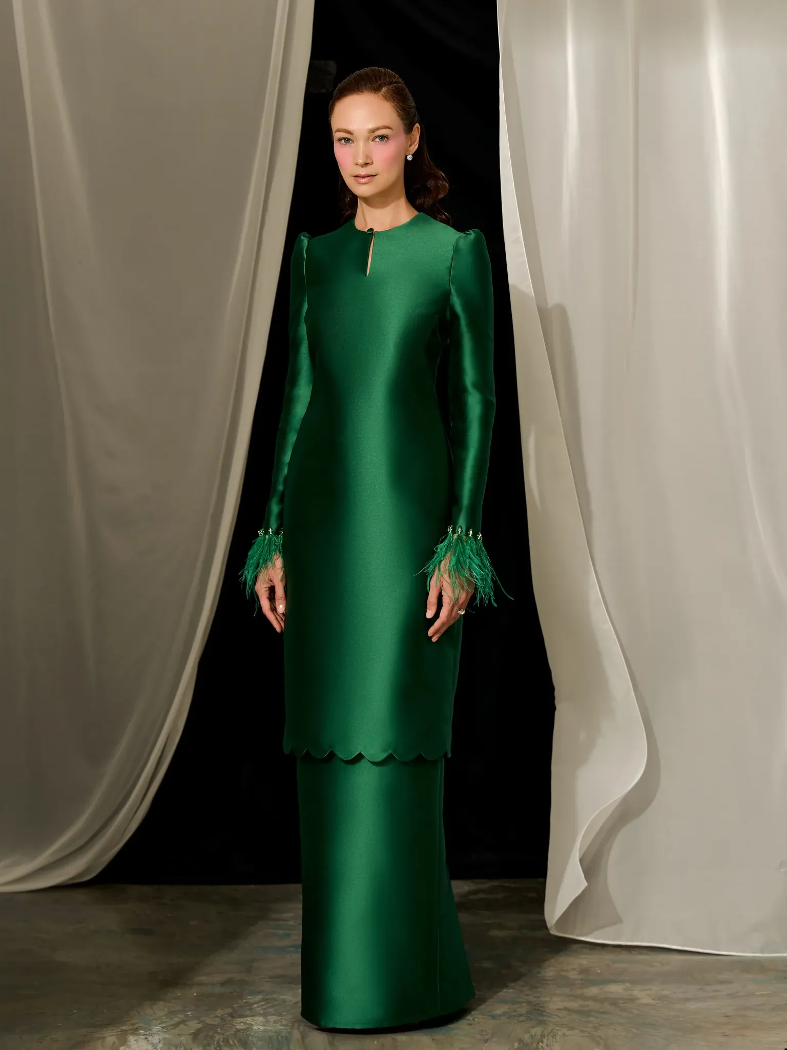 The pencil-cut skirt, designed for a sleek silhouette, includes a back pleat for graceful movement and a waistband with elastic side panels for added comfort. Finished with a back zipper and hook fastening, this kurung is a timeless masterpiece, perfect for formal occasions and evening soirées.