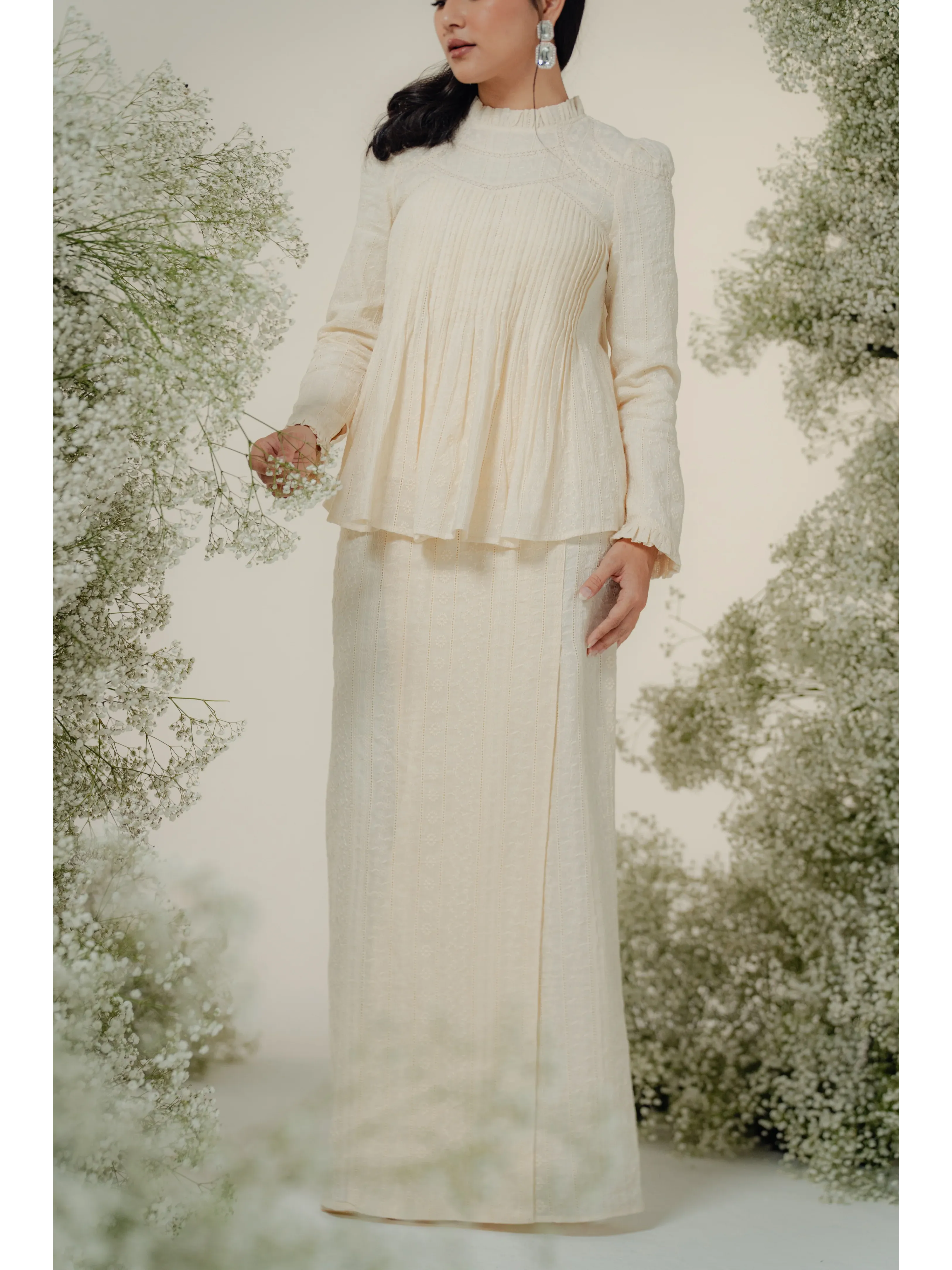 A fresh take on Zora’s beloved bestseller, The Jannah Kurung in Cream is where romantic tradition meets timeless elegance. Crafted from 100% cotton and adorned with intricate broderie anglaise embroidery, this two-piece set is the perfect choice for akad nikah, Raya mornings, or intimate celebrations.